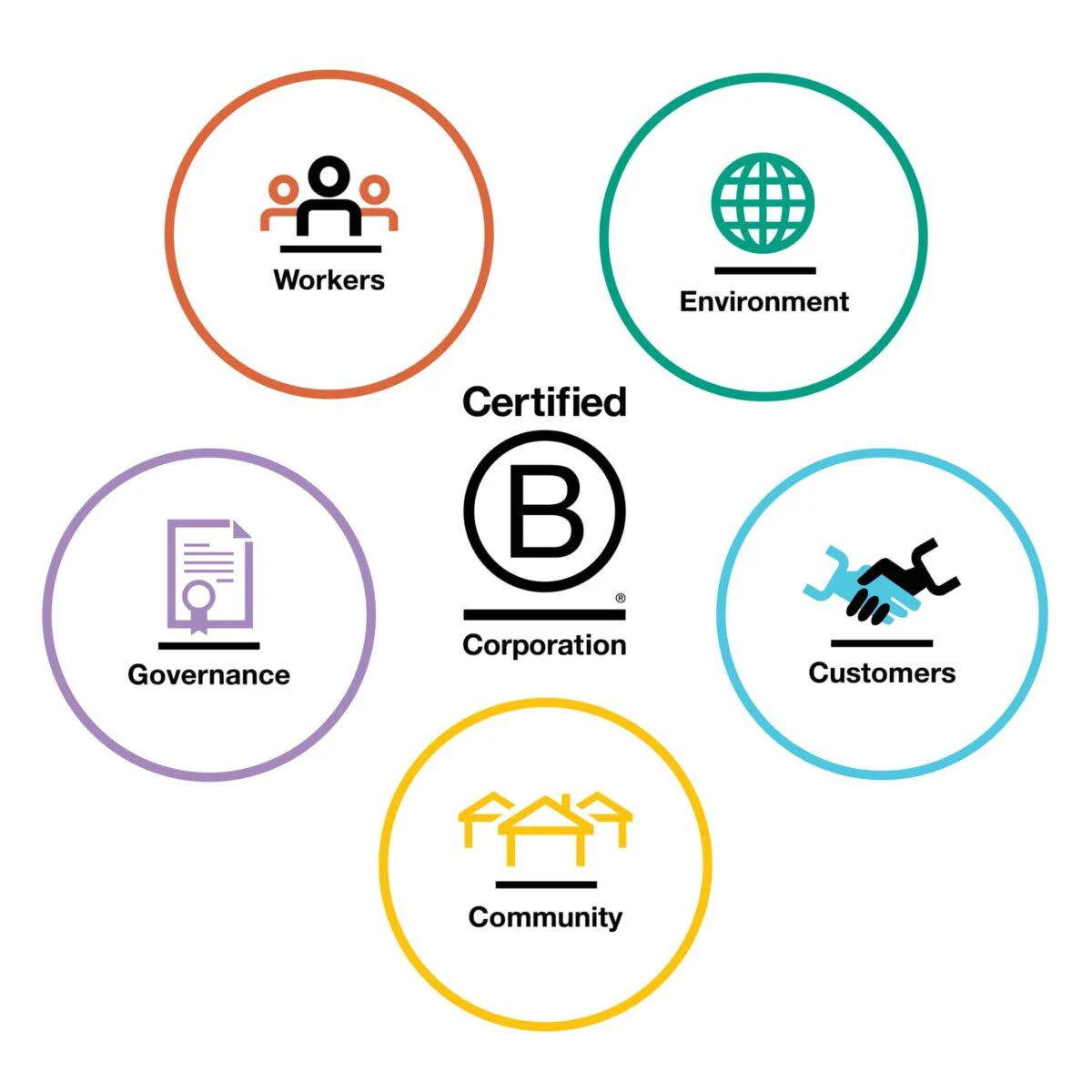 Every B Corp™ is scored using the five impact areas in the B Impact Assessment: governance, workers, community, the environment, and customers.